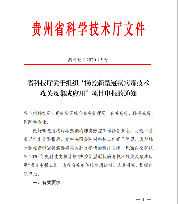 當前位置:首頁(yè)>科(kē)學(xué)教研>科(kē)研管理(lǐ)貴州省科(kē)技(jì )廳“防控新(xīn)型冠狀病毒技(jì )術攻關及集成應用(yòng)”項目申報的通知