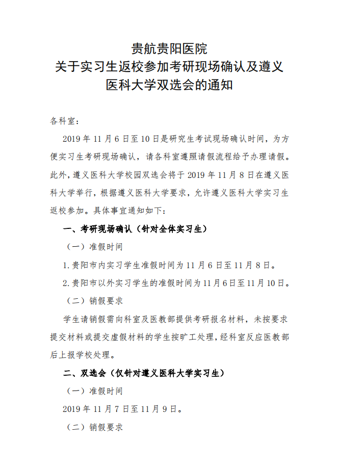 【通知】關于實習生返校參加考研現場确認及遵義醫(yī)科(kē)大學(xué)雙選會的通知